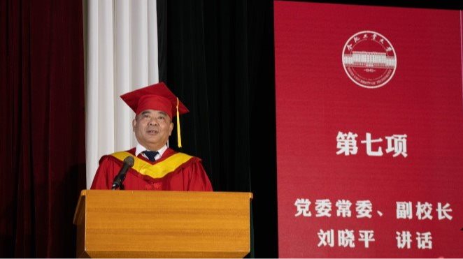 校党委常委、副校长刘晓平在讲话中代表学校向圆满完成学业并顺利获得学位的各位同学表示热烈的祝贺,向关心、支持学生完成学业的老师、学生家长表示衷心的感谢。他希望同学们要继续刻苦钻研、努力拼搏,胸怀“国之大者”,与时代同频共振,成为伟大事业的接班人;要不负时光,坚持实干兴邦,发扬工大优良传统,争做时代弄潮儿,牢记初心使命,自觉把个人理想融入国家伟大事业之中,让创新成为青春远航的动力;要笃行不怠,保持从容乐观,培养终身学习的好习惯,多读书,读好书,用发展的眼光引领人生,做敢于担当的时代新人,过幸福洋溢的健康人生。刘晓平表示,无论大家今后身在何方,母校永远是大家最坚强的后盾,最温暖的港湾,祝愿全体毕业生在新的人生征程中前程似锦、平安幸福!