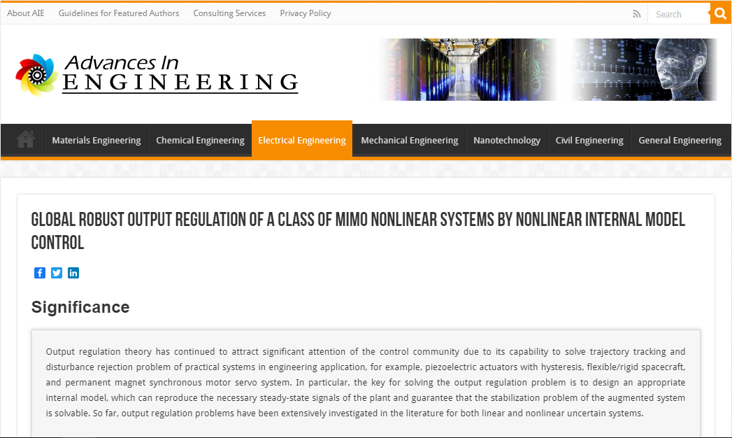 平兆武教授课题组发表在控制领域著名期刊《International Journal of Robust and Nonlinear control》的研究论文被国际著名工程学科技机构“Advances In Engineering”(简称AIE)遴选为关键科学文章(a key scientific article),并以“Global robust output regulation of a class of MIMO nonlinear systems by nonlinear internal model control”为题在电气工程(Electrical Engineering)栏目进行专题报道。
