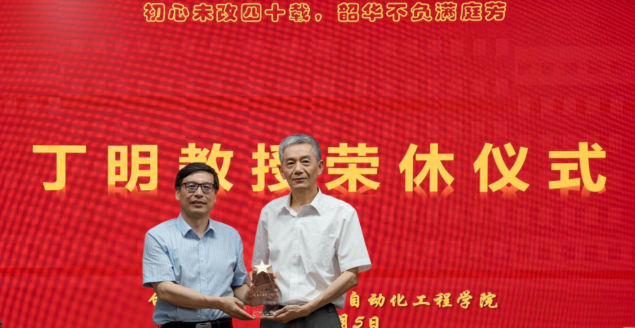 仪式中,院长向念文代表学院赠送了鲜花,副校长丁立健颁发了学院定制的从教四十年的水晶纪念杯。
