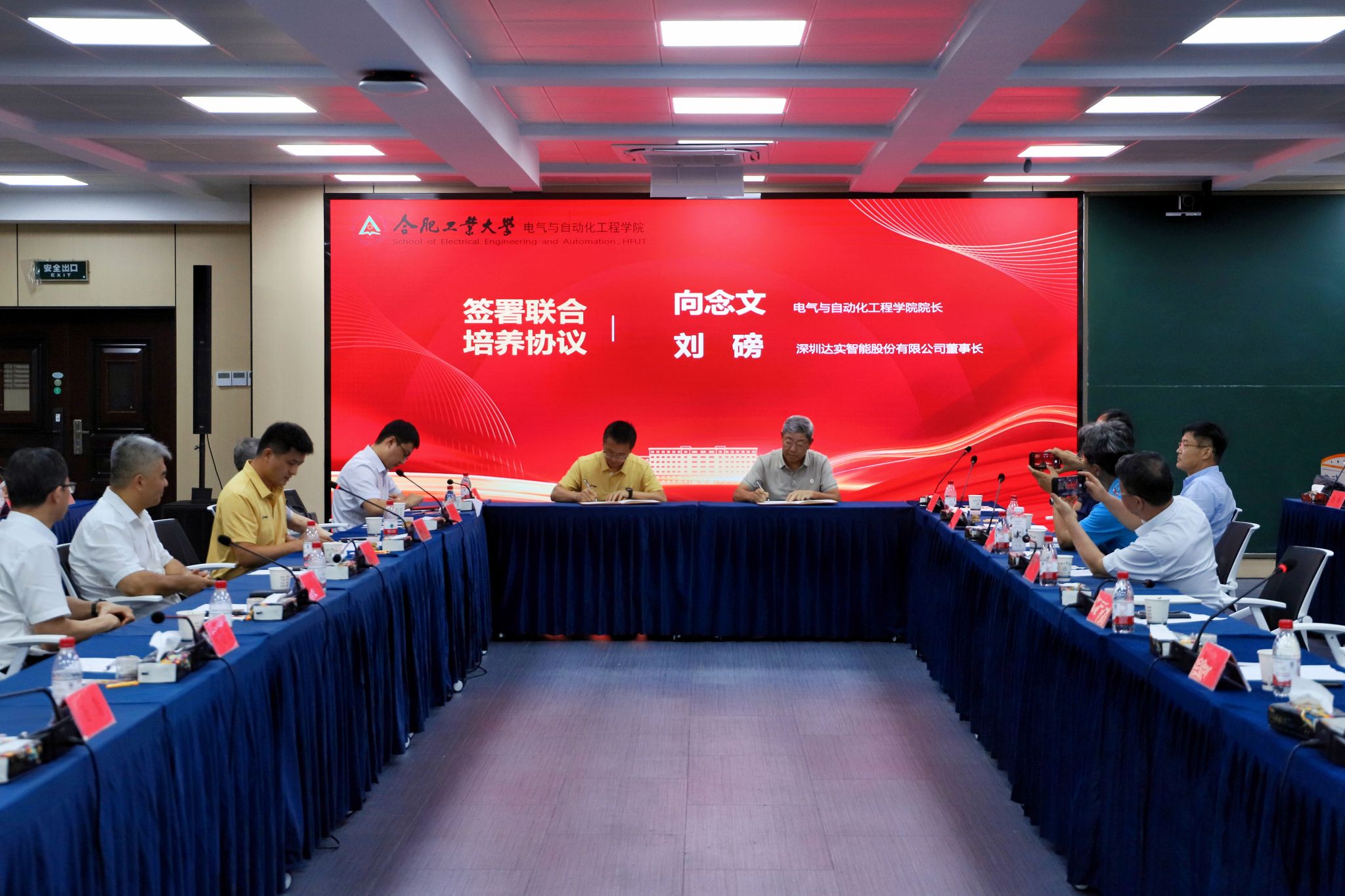 党委书记冯航主持,学院院长向念文与刘磅签署联合培养及实习项目协议,发展联络处负责人、电气学院领导班子成员以及往届受助学生代表参会。