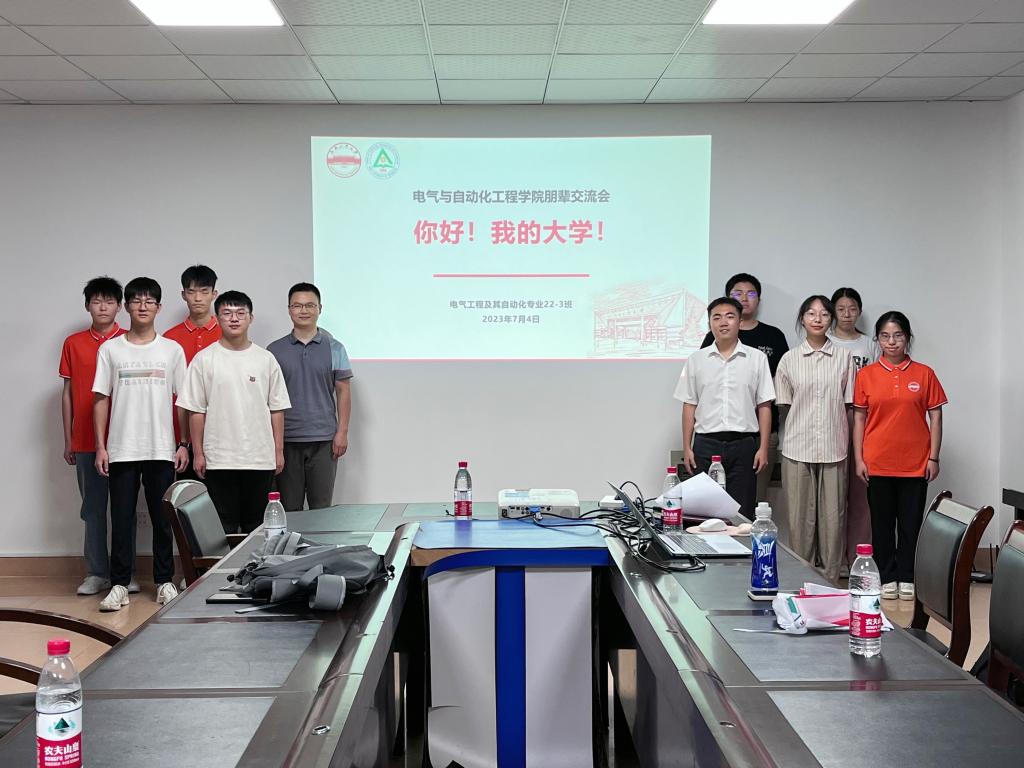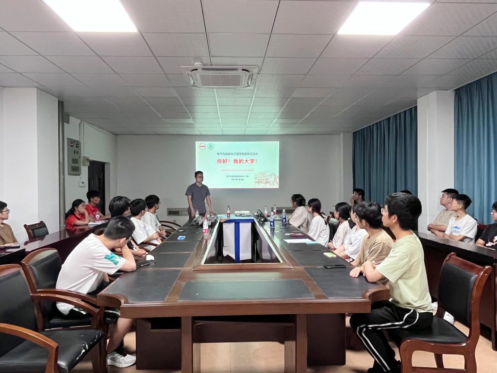 在逸夫楼1004组织开展“你好!我的大学!”朋辈交流会,班主任薛建议老师、2023届双肩挑辅导员吴泽城老师,王翔宇和袁闯同学应邀进行交流与分享,电气工程及其自动化22-3班同学参与。