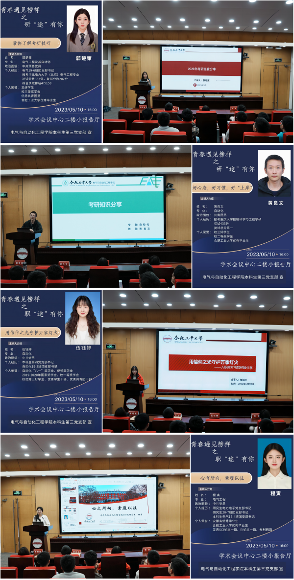 考研至重庆大学的黄良文同学结合个人经历,深入浅出地介绍了考研的具体流程,用数据为同学们分析了考研的局势,鼓励同学们以打好基础为前提,多多阅读相关的专业的书籍,拓展视野;考研至华北电力大学(北京校区)的郭楚策同学以“准备”为关键词,从目标院校的选择与考试科目的复习两个方面,为同学们提供了了解院校的途径与时间分配的方案,还细心推荐了相关的学习软件;入职至南方电网的伍钰婷同学以“用信仰之光守护万家灯火”为切入点,强调了适合自己的才是最好的,并从目标的确立,学习生活,考试准备三个方面分别进行了详细的介绍,以个人大学四年的学习生活为例子,为迷茫的同学们提供了学习的方向;入职至南方电网的程寅同学通过个人的本科与研究生学习生活,从课堂学习、课外竞赛与校外实践等方面讲解了如何提高自身的竞争力,为同学们介绍了“互联网+”,“ican创新创业大赛”等活动,鼓励同学们积极报名,开阔眼界,并以个人的求职为参考,为同学们讲解了求职场上的技巧。活动现场,同学们积极与朋辈导师互动,踊跃地针对自身情况进行提问,朋辈导师则根据自身经历耐心细致地回答,现场气氛热烈。参会同学纷纷表示,在朋辈导师精彩的分享中找到了启发,对于自己未来职业目标与方向也越发清晰和坚定。