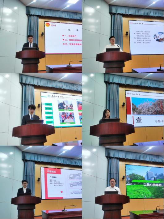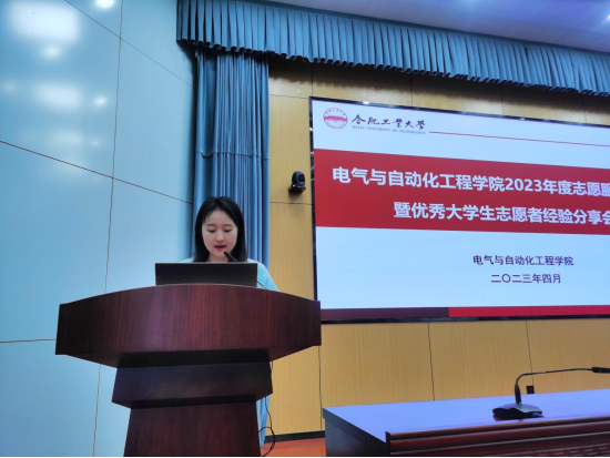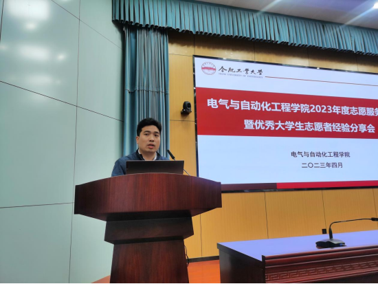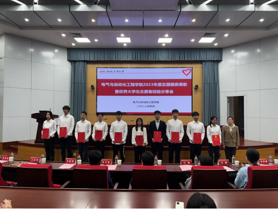 分享交流环节,十佳大学生志愿者代表分主题开展志愿服务经验分享,李子昊以《爱出者爱反,福往者福来》为题介绍自己的志愿服务和心得感悟,重点向同学们分享了无偿献血的先进事迹,激励青年学子在服务奉献中实现自身价值。信冉通过初相识、向阳生、系老情、展蓝图四个部分介绍自己从坚守初心到茁壮成长再到使命传承的志愿经历。张帆重点介绍了自己在儿童帮扶、校园宣传、志愿服务等方面的事迹,从个人素养提升、培养社会责任感等方面介绍了志愿服务的价值意义。丁浩航从社区治理、文明实践等方面展示了自己的志愿服务经历,鼓励同学们投身志愿服务,贡献青春力量。电气20-6班王子康、电气20-5班王翔宇代表志愿服务先进班级做经验分享,介绍了班级开展志愿服务的整体情况、特色活动和突出典型,介绍了“党建引领团建,团建带动班建”总体格局,党团员带头服务,营造了人人参与志愿,人人乐于服务的良好氛围。受表彰的先进班级和个人有的利用寒暑假奋战在疫情防控、抗洪救灾一线,有的投身敬老助老服务,助力社区文明建设,有的热心教育事业,关爱困境儿童,陪伴成长成才,有的积极宣传环保理念,以实际行动守护美好家园,志愿者的优秀事迹感动了现场每一名观众,热烈的掌声在会场此起彼伏。