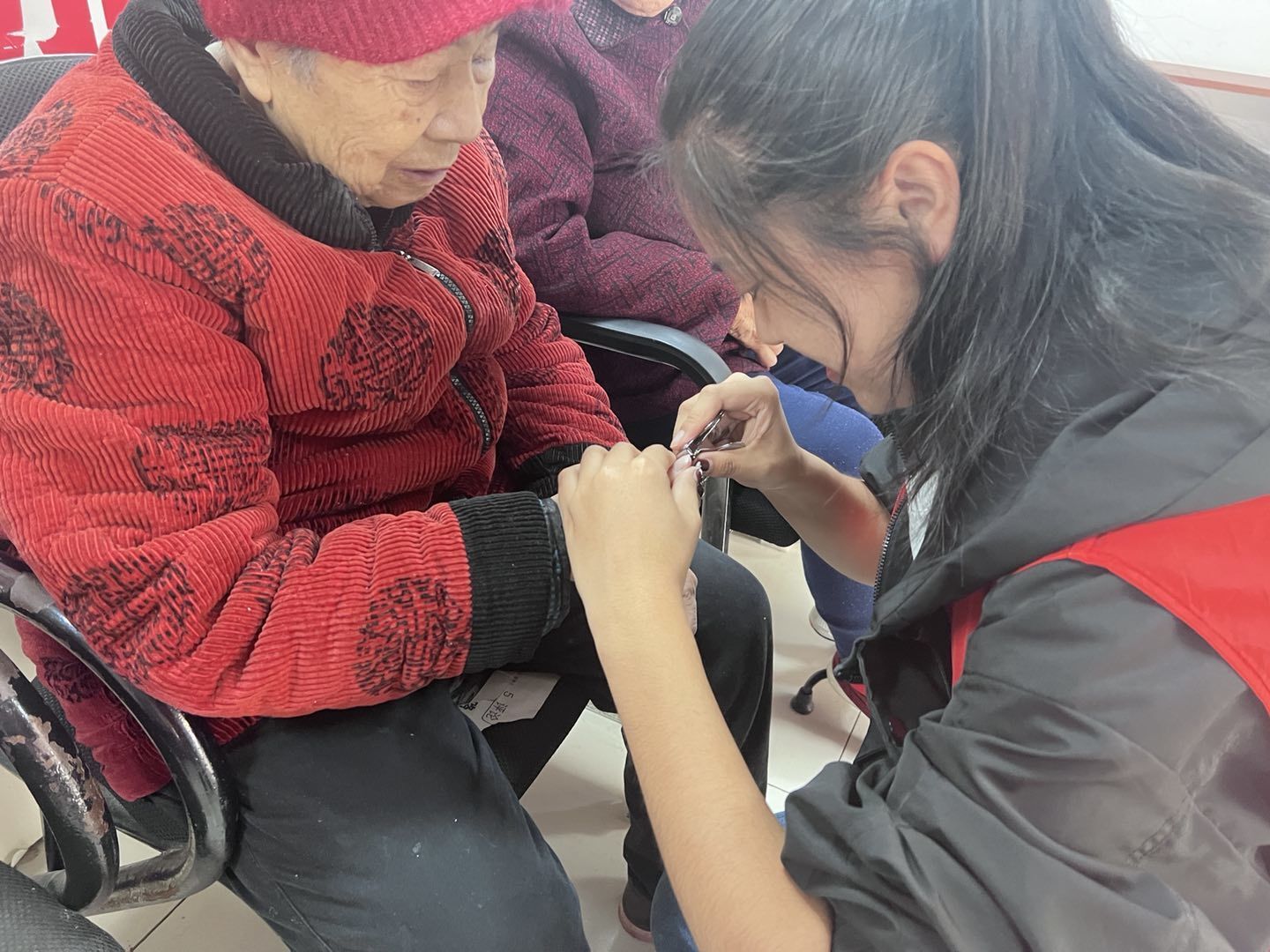志愿者为老人修剪指甲