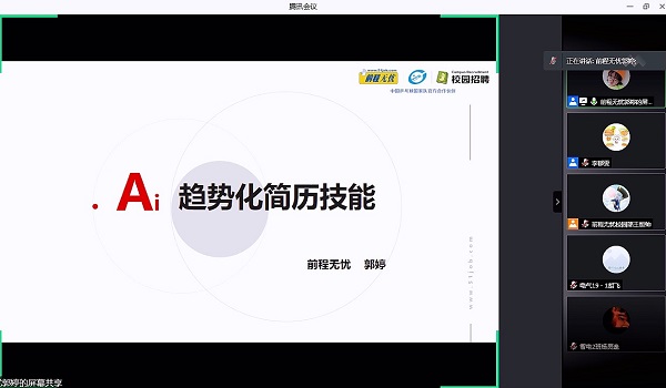 举行“AI趋势化简历技能”线上讲座。活动邀请了前程无忧校园部经理王恒帅全程在线互动,前程无忧校园招聘部项目执行经理郭婷老师担任主讲,百余名同学参加在线培训。