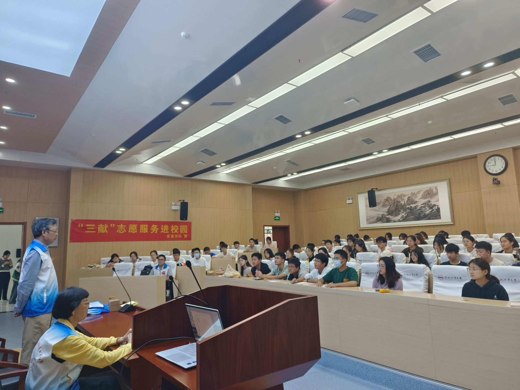 联合管理学院在管理楼第二报告厅开展献血站志愿服务培训讲座,邀请合肥血站省直分队队长文世乐、副队长姜从山、黄国荣开展“三献知识进校园”志愿培训讲座,电气学院、管理学院100余名志愿者代表参加培训讲座。