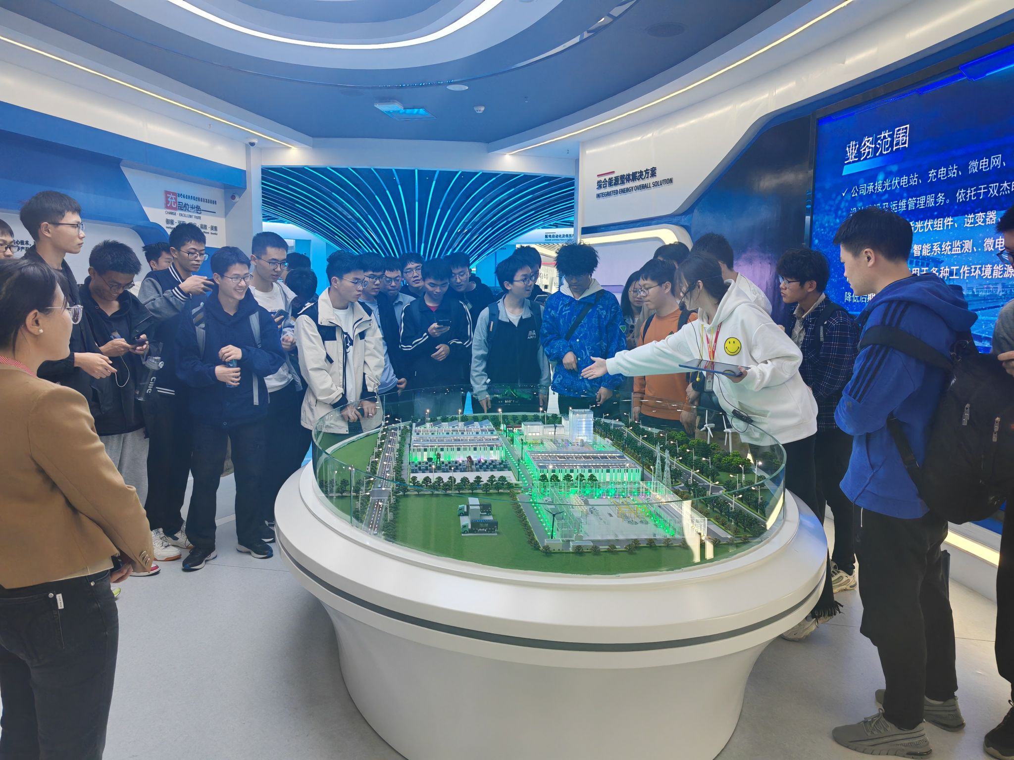 在讲解人员的带领下,全体师生参观了企业展厅和数字化工厂,了解双杰集团数字化为核心的全产业生态链,智慧能源领域建设运营一体化综合能力,绿色出行领域拥有重卡换电、充电桩一站式方案解决能力等综合概括;详细参观展厅展示的全绝缘系列产品、高低压成套设备、箱式变电站、电缆分支箱和自动化保护设备等自主创新科技产品;感受智能制造的各个环节,了解设备制造、高新科技产品性能与质量,体会双杰集团创新精神,体验数字化生产的科技力量;实地走访了公司的羽毛球场、健身房、图书馆等设施,体会到公司的人文环境。