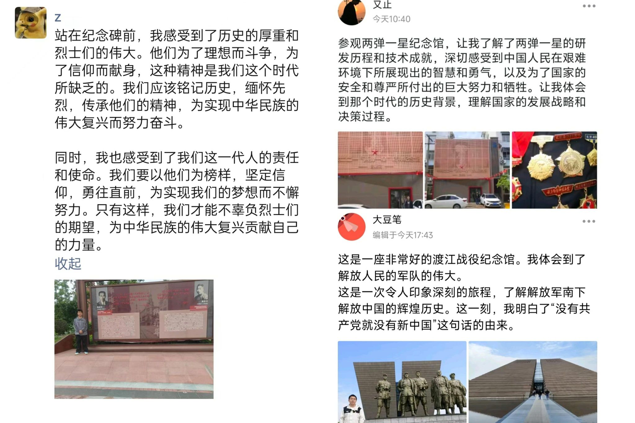 青春脚步寻古迹,五四荣光耀心田。传承红色基因,赓续红色血脉。当“五一”小长假遇上“五四“青年节,同学们利用节假日返家乡,来到全国各地党史重要遗址、旧址等开展讲述党的故事、缅怀革命先烈、寻访红色地标、寻访英雄模范等红色足迹寻访,重走那些革命先烈奋斗的足迹,用镜头捕捉那些历史瞬间,在追寻红色记忆的同时,深刻感受五四精神的时代价值。在打卡的过程中,同学们深入了解了五四运动的历史背景、伟大意义和精神内涵。同学们以青春的热情,昂扬的状态,诠释五四精神中敢于担当、勇于创新的品质。每一次按下快门,都是对历史的致敬;每一次分享照片,都是对五四精神的传承。