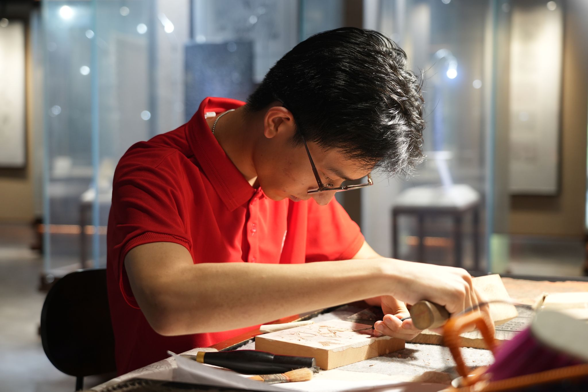 亲历得以明匠心。山东自生堂年画博物馆中,在相关负责人的带领下,团队一行参观了财神像、童子像、动物像等木版年画原板,更加深入地接触了古人以石为地、以刀代笔勾勒出的“艺术画卷”,了解到了年画背后持续演变的生活习俗与思想动向。过程中,团队成员亲历木版年画雕刻全过程,在一刀、一振、一刷、一按的体验中对话时空,在行云流水、错落有致的瑰宝里体悟匠心,以青年手中的细腻刀法,斧凿出意蕴深远的历史文风,镌刻独有的中国记忆和印韵年华。