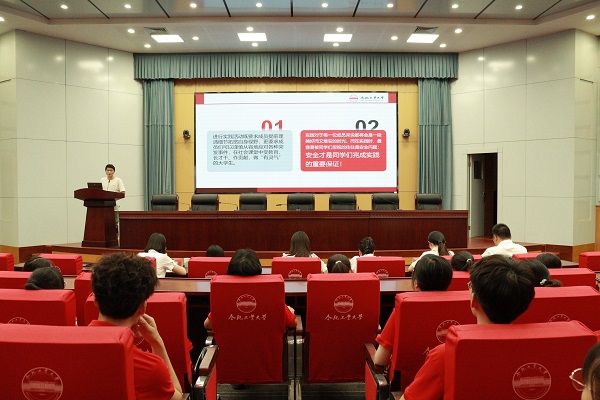 伴随着激昂的国歌,活动正式启幕。学生会秘书长侯崇琦为同学们介绍暑期实践安全应急预案及注意事项,援引“三下乡”经验,围绕行前筹备、路途安全、住宿保障、人身财产防护、实践过程安全及应对极端天气等维度,以实例为鉴,深入剖析安全要点。他强调,安全为基,需严守纪律,团结协作,要文明守法,共筑工大荣光。