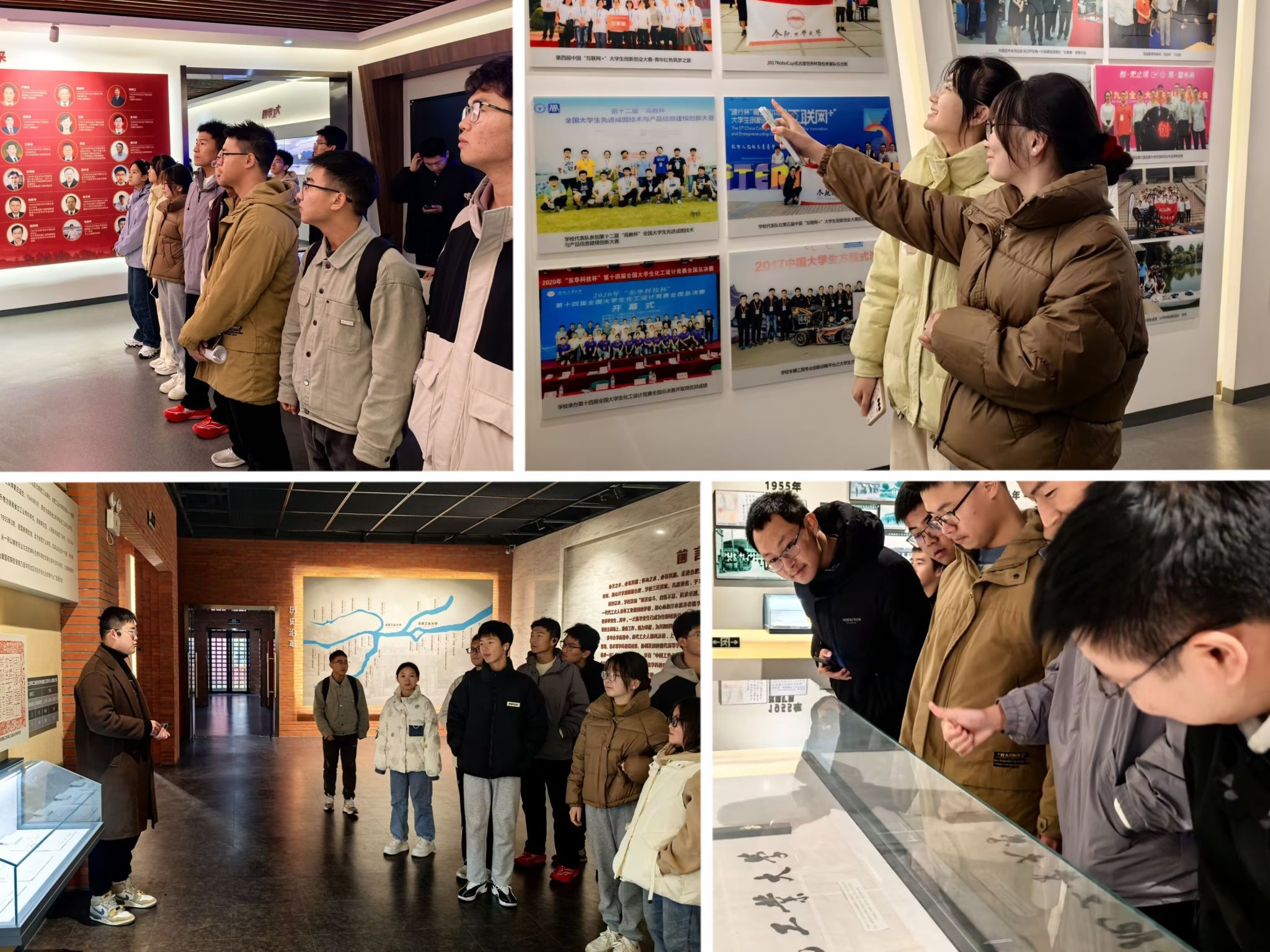 穿越时光长河,触摸工大灵魂。随后,同学们来到校史馆,在讲解员的带领下,同学们穿过“院士走廊”,缓步走入展馆,映入眼帘的便是“厚德、笃学、崇实、尚新”的校训,随后步入“走进工大”,同学们步入工大校史厅、工大荣誉厅、改革前行厅、创新发展厅、硕果累累厅,同学们或驻足观看交流或仔细听讲,十分认真。每一件展品、每一位院士都加深了同学们对校训的理解,对校园文化的感悟,激励同学们不断前行。