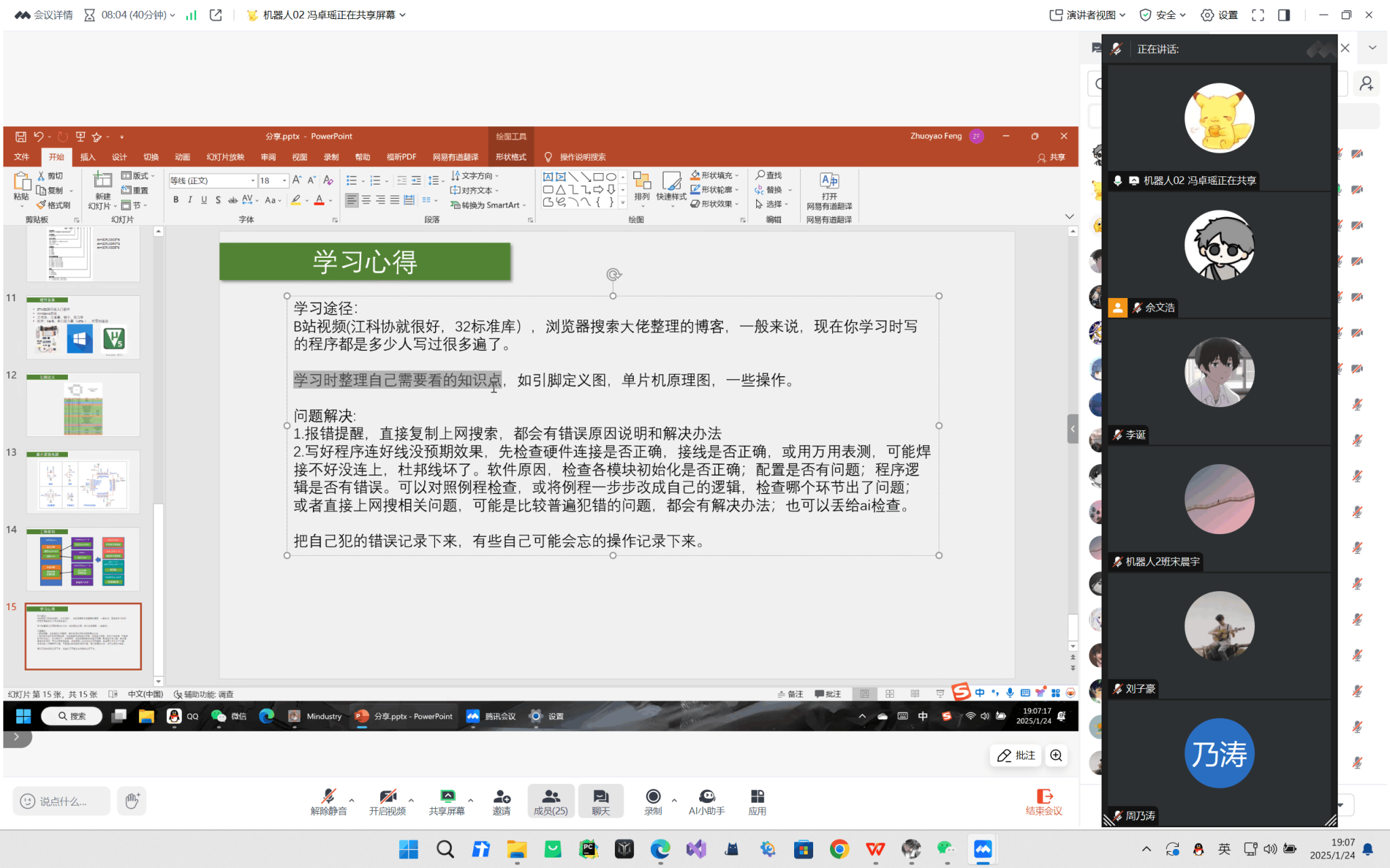 硬核朋辈课程矩阵,知识赋能成长新范式。寒假期间,学院精心策划并开展了为期三周的线上学习活动,巧妙结合线上直播授课与课后实践,邀请优秀同学冯卓瑶、佘文浩、李诞担任讲师,倾心分享,传授经验。冯卓瑶深入地讲解了单片机原理与编程技巧,佘文浩则聚焦机器视觉基础算法与应用案例,李诞详细介绍了ROS的基本架构与应用开发,并结合实际项目进行案例分析,助力同学们将理论知识与实践应用融会贯通。此外,他们结合自身学习经历,分享假期高效学习秘诀和实用学习资源,引导同学们利用碎片化时间提升自身技能,实现从“宅在家”到“学在家”的转变,助力实现“沉浸式学习-项目式实践-体系化提升”的认知跃迁,大家纷纷表示,合理规划时间,专注学习目标,才能让假期成为提升自我的“黄金时间”。