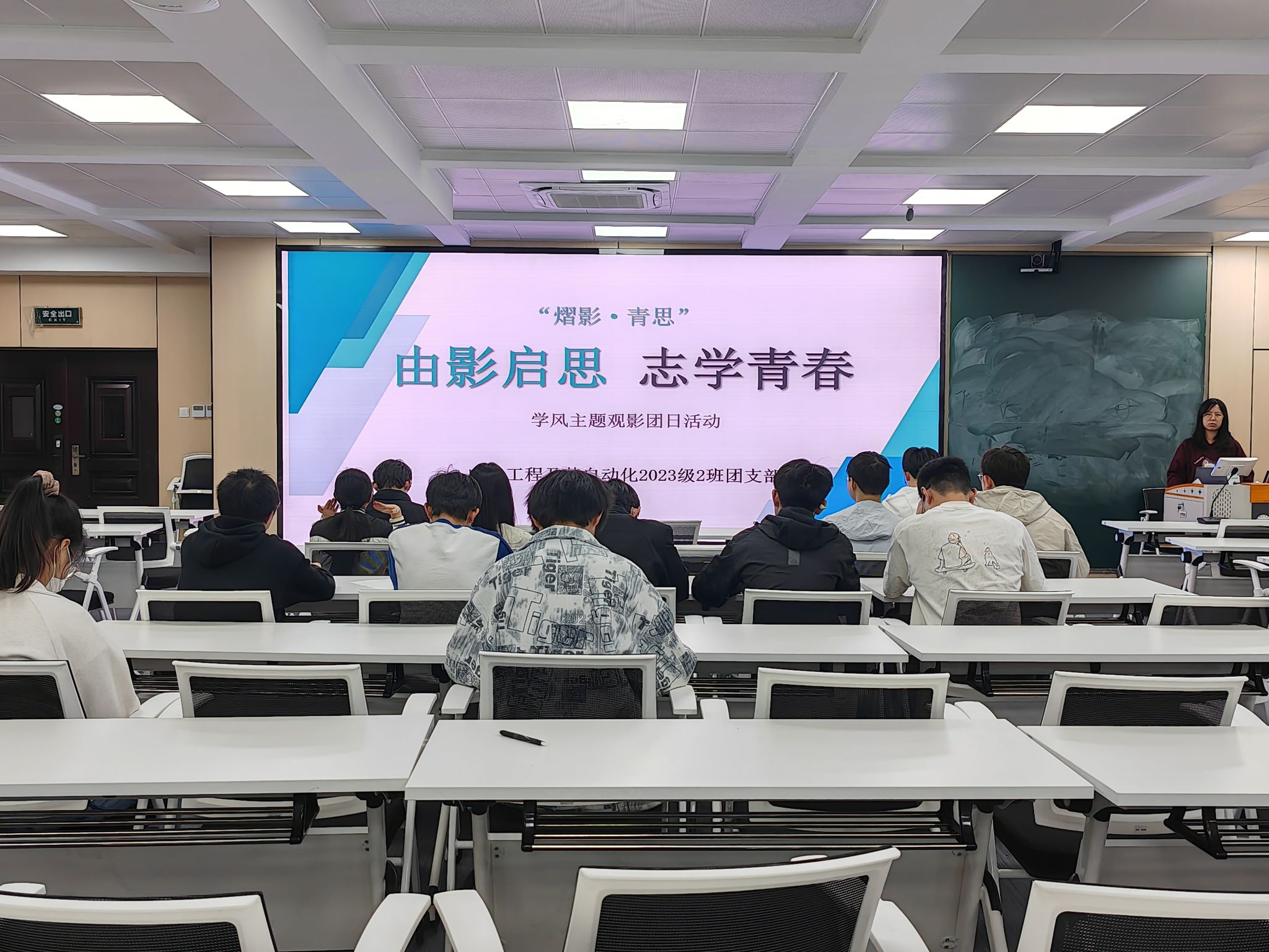 于逸夫楼1005开展“由影启思,志学青春”学风主题观影实践活动,电气工程及其自动化专业2023级2班团支部全体同学参与活动。