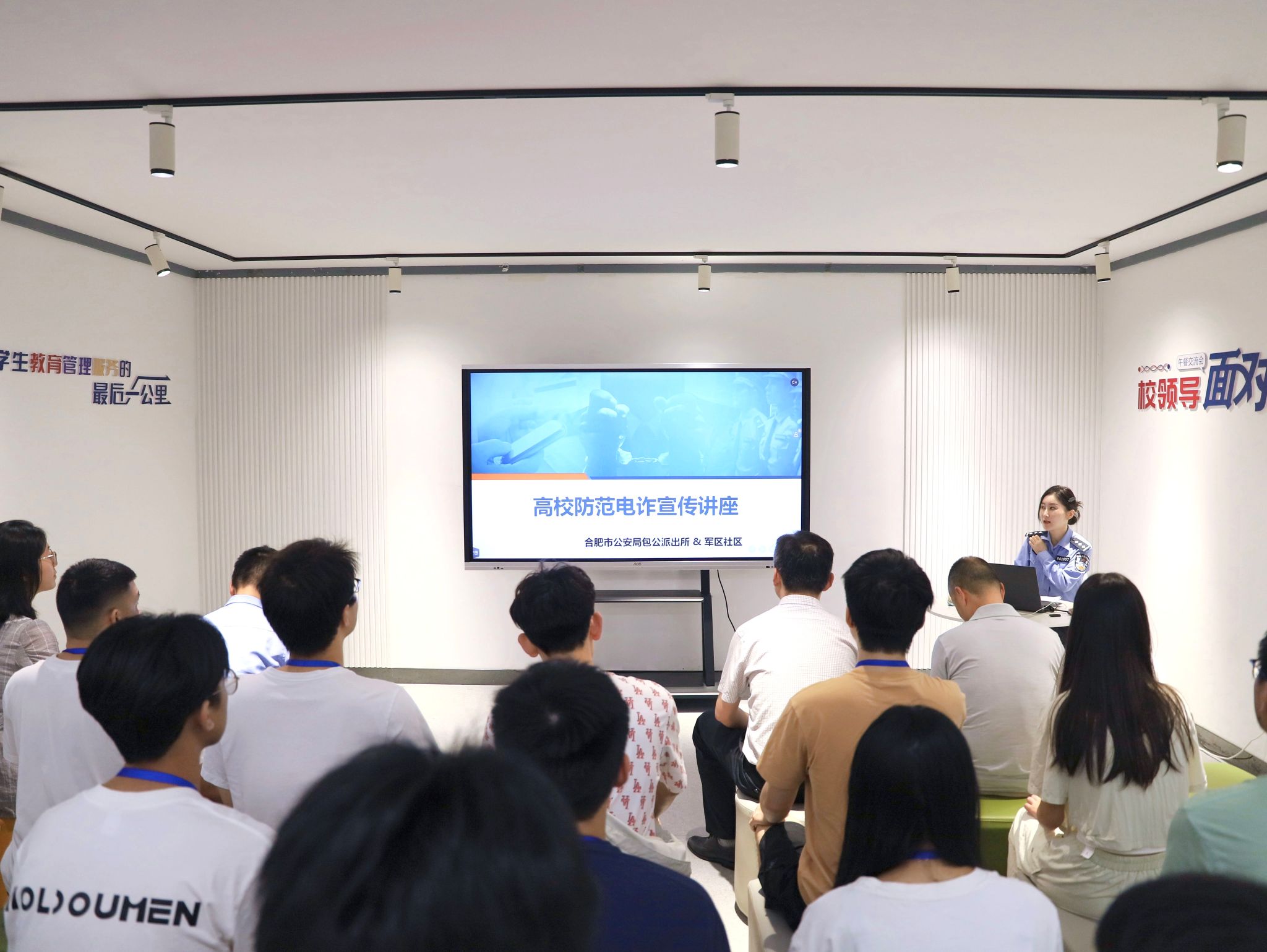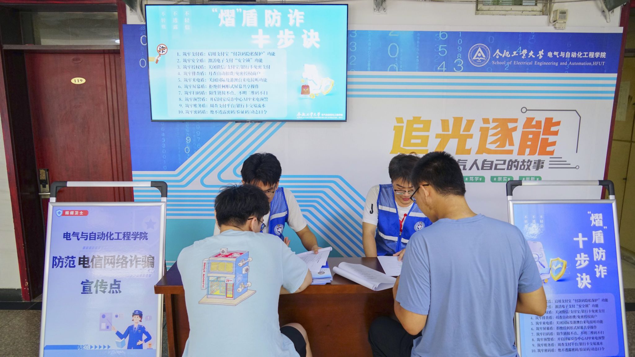 6月17日起,学院在屯溪路校区二号南楼开展“辉熠卫士防诈社区课堂”,学院志愿讲解员为学生普及高校群体中高发的电信诈骗类型及防范措施,演示启用支付宝“付款码隐私保护”、激活电子支付“安全锁”功能等十项防范电信诈骗的实用技能,推动安全知识进学生社区、进学生心中。