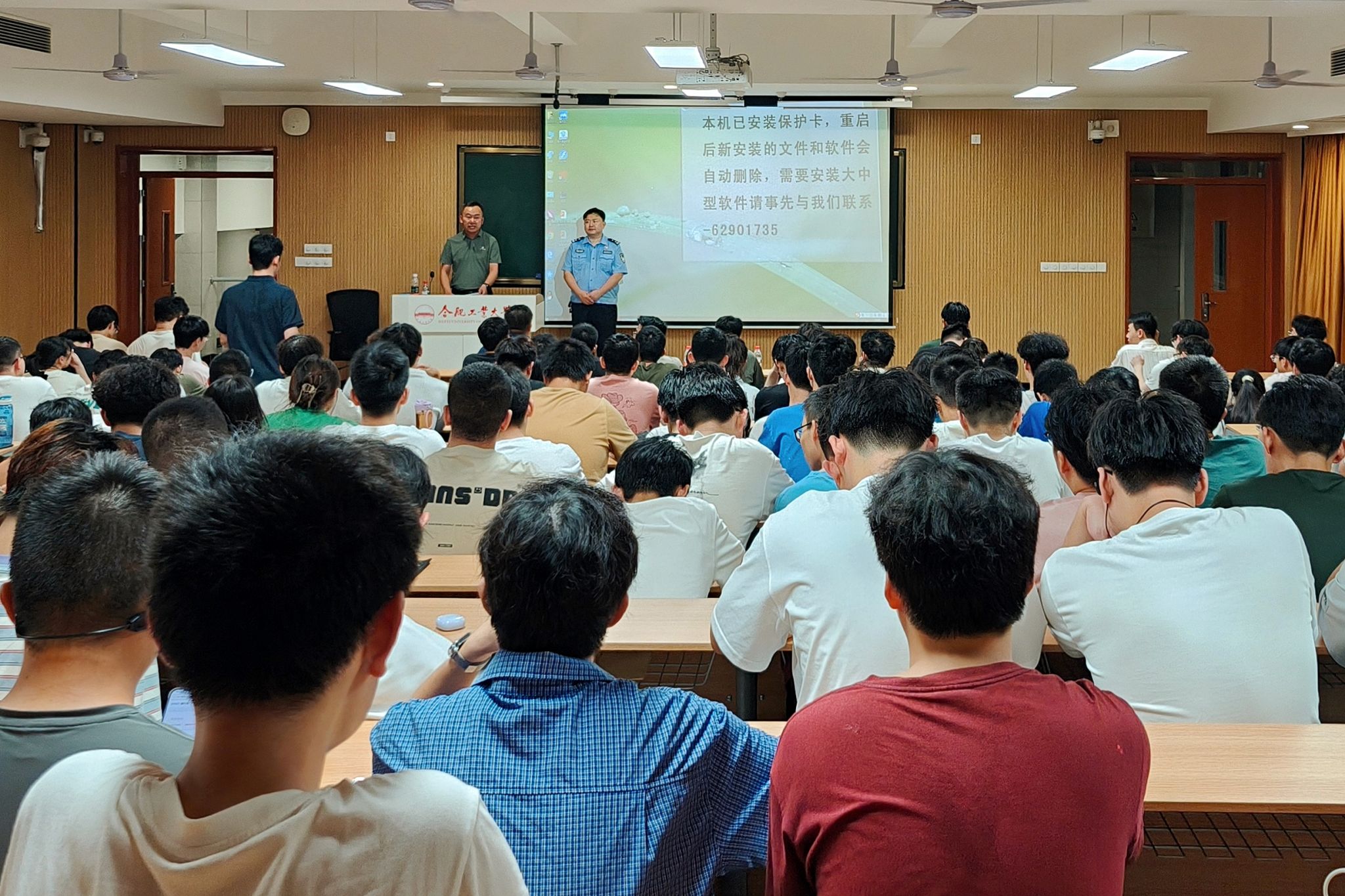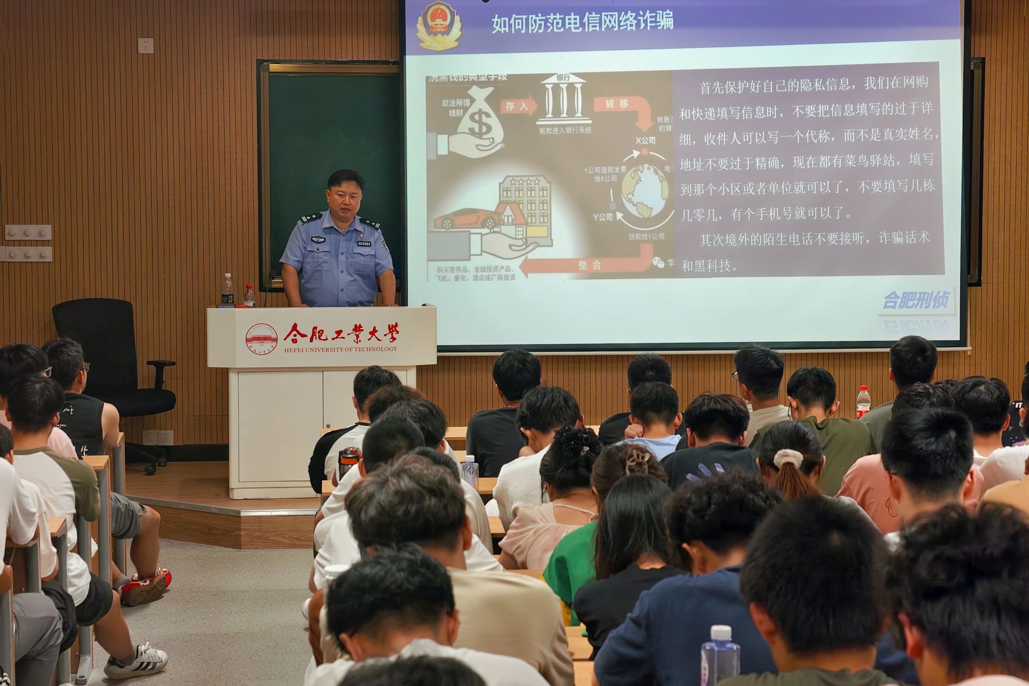 于屯溪路校区西二教学楼402开展防范电信诈骗专题讲座,合肥市公安局刑侦支队二级警长朱云龙受邀主讲。