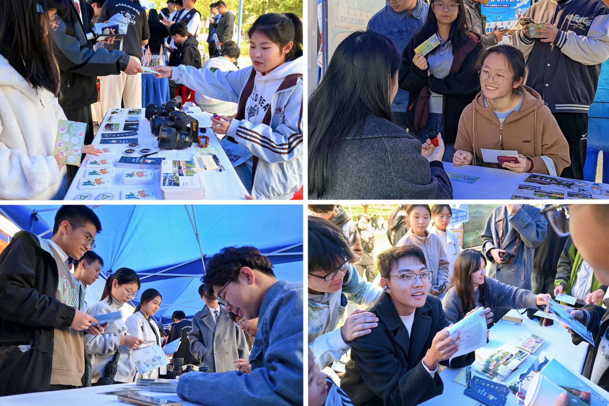 学院集市帐篷包含多块区域。主旨版块体现学院网络文化工作室理念成果及网络思政育人体系;文创版块集中展示学院自主设计的徽章、书签、明信片等,并轮播原创校园微电影等网络作品;闯关版块基于“飞花令”小游戏,设计了包含校史校情、反诈常识在内的答题内容,供给充足纪念品奖励;留念版块依托学院形象IP“熠鹿”,提供趣味打卡、玩偶互动、创意合影等环节。