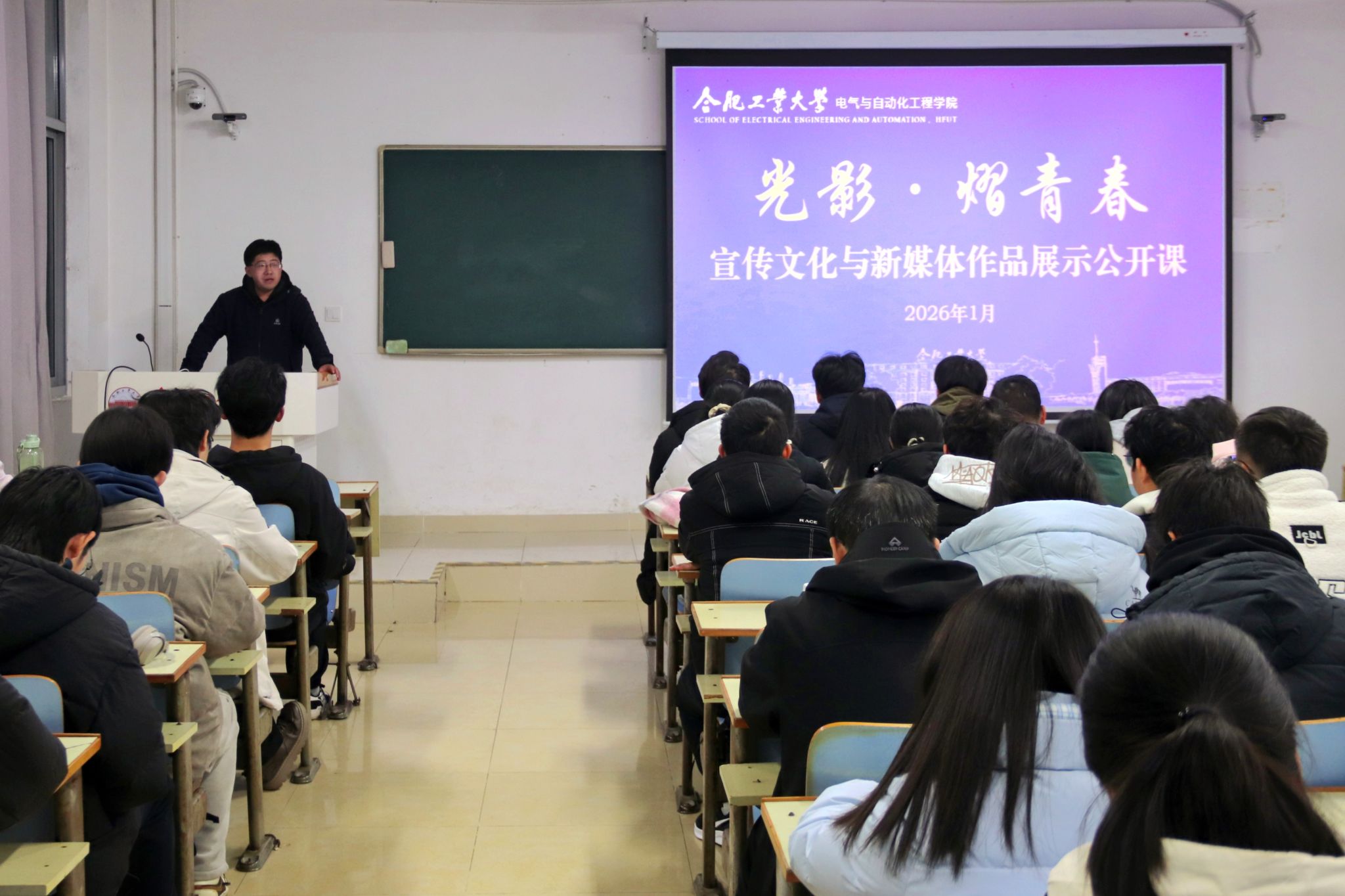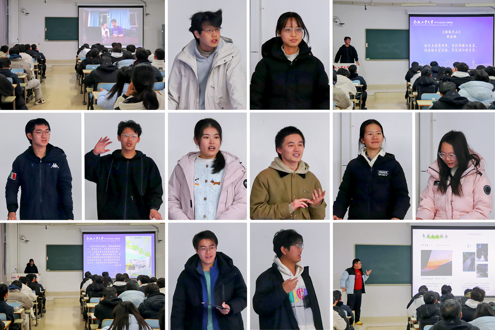 公开课围绕光影、文韵、音律、微视、篇章5个单元依次展开。光影单元中,蒋火珠、梁小康分享了岳阳洞庭湖与工大斛兵塘的平面设计海报,刘一飞、宁若溪、马誉轩分别展示了使用特殊镜头、前景构图、延时曝光的摄影作品。文韵单元中,郝嘉楠、樊宸楷解读了原创诗词《游敬亭山》与散文诗《薄暮浮墨》的写作思路。音律单元中,王鹏陈现场诵读《最可爱的人》片段,并结合音频录制作品,分析了媒体收音的特点。微视单元中,师生集体观看学院原创反诈主题微电影《他?她?AI!》,马一朗、张然分别讲述了视频拍摄与参演的心得收获。篇章单元中,丁一珂结合2025年度总结主题推文,展示了微信推送的选题、图文对接与编辑流程。