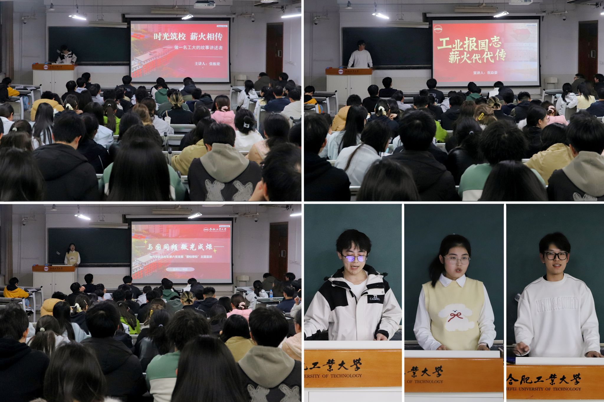 学院“星熠宣讲团”三组成员紧扣爱校荣校主旨,依次进行现场宣讲展示。张栋梁以《时光筑校,薪火相传》为题,讲述了学校从1945年至今的历史沿革,阐释了斛兵塘畔深厚的人文底蕴,表示愿通过研读校史校情,做一名工大故事讲述者。张然以《与国同频,微光成炬》为题,展示了校园风物与科技成果的历史图片,分享了多位杰出校友的求学创业故事,希望工大学子在成长之余,成为学校文化传承的火炬手。祝焱豪以《工业报国志,薪火代代传》为题,围绕工业起源、工业初心、工业成就、工业精神等层面,讲述了工大服务国家重大战略需求和区域经济社会发展的八秩历程。