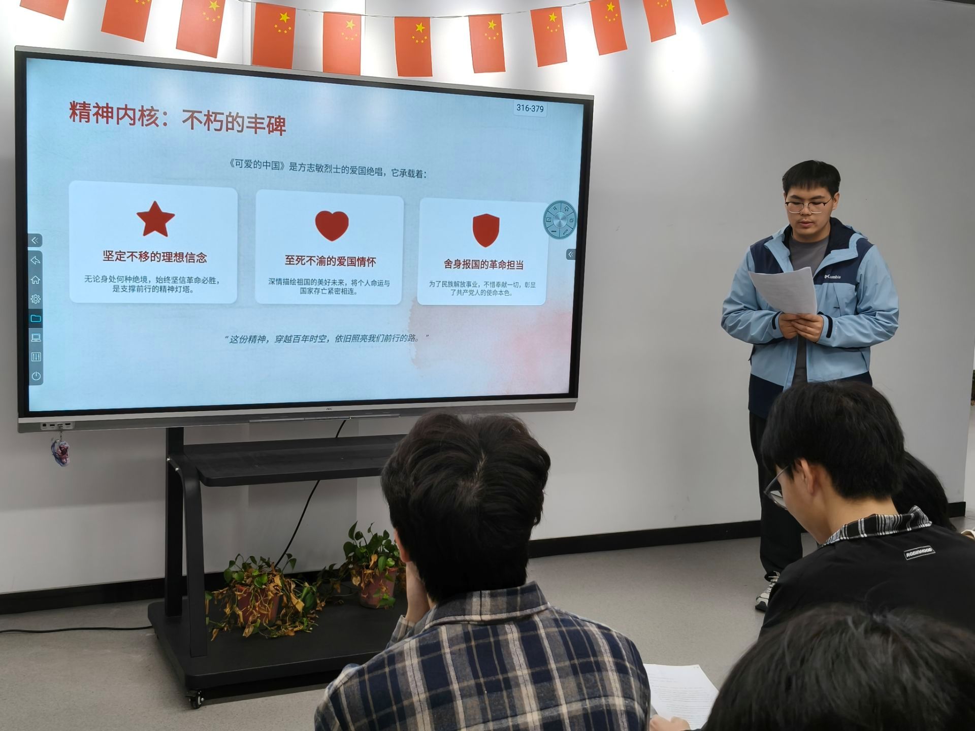 活动伊始,主持人介绍了《可爱的中国》创作背景,带领同学们走进那段风雨如晦的峥嵘岁月,感受革命先烈身陷囹圄却心系家国、至死不渝的赤诚之心。同学们在文字中体会方志敏烈士对祖国母亲的深情眷恋、对民族解放的坚定信念,以及对中国光明未来的热切期盼,现场氛围庄重而温暖。