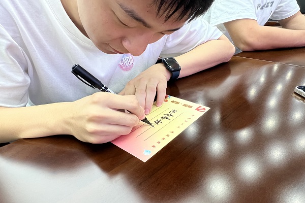 与会成员在明信片上写下对祖国的祝福