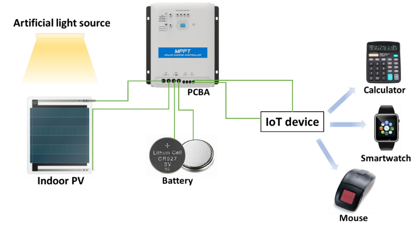 物联网(Internet of Things)技术的快速发展驱动了基本能源供给方式的改革。目前,低功耗自主物联网传感器主要利用储能电池供电。然而,储能电池寿命有限且应用范围受限。研究所创新开发新型能量收集技术,助力物联网技术可持续发展。先进室内光伏(Indoor photovoltaics)从环境照明中收集能量,可为基于低功耗蓝牙、RFID标签、LoRa、无源Wi-Fi、Zigbee等通信协议的无线物联网节点提供可持续能源供给。